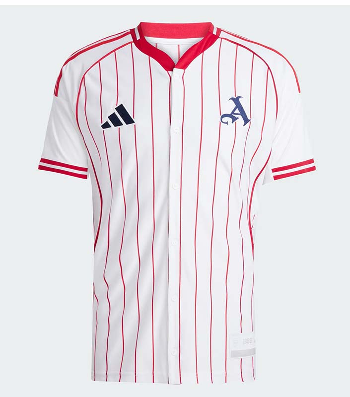 This adidas shirt fuses baseball diamond DNA with football field style. Pinstripes, a button closure and that eye-catching team name on the back bring a stateside-inspired look and feel to a match jersey silhouette. Soft fabric ensures you stay comfortable while you hit your Gunners fandom out of the past.