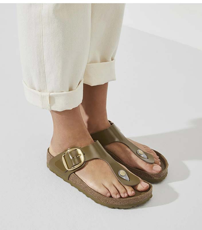 The BIRKENSTOCK Gizeh is a genuine classic that combines optimum grip with minimalist, fashionable design. The Big Buckle version features a large, elegant pin buckle. The semi-exquisite footbed is fully lined with soft piumato leather, making it exceptionally comfortable. The upper is made from high-quality natural leather with a shiny patent coating.