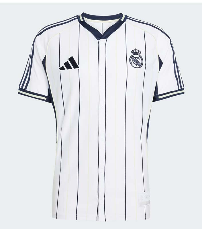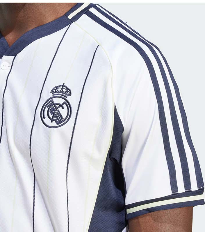 Two sporting worlds collide in this Real Madrid shirt from adidas. Merging the all-American look of a baseball jersey with a traditional football-inspired design, it teams pinstripes, a button closure and a Los Blancos badge. Whether you’re cheering from the stands or kicking back on the couch, this statement-making top delivers sporty style for any occasion.
